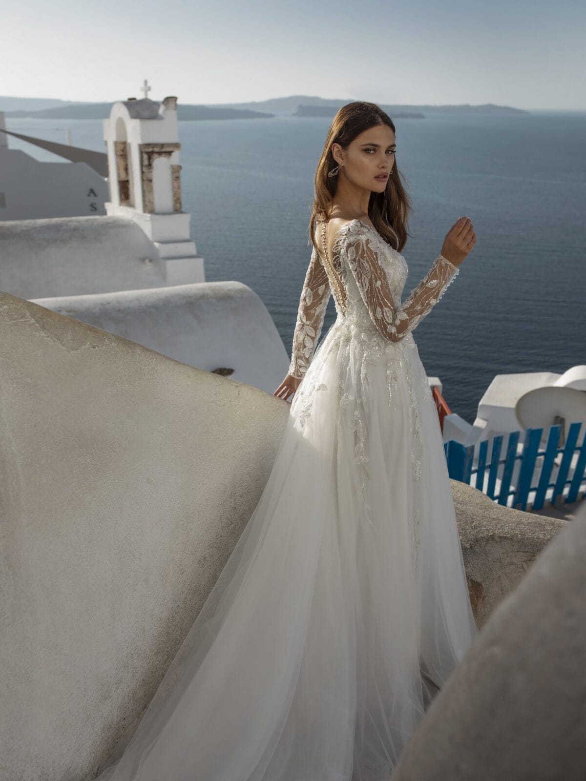 Paola ist perfekt für eine Hochzeit in den kälteren Jahreszeiten geeignet. Das Kleid ist aufwändig bestickt und hat elegante lange Ärmel.